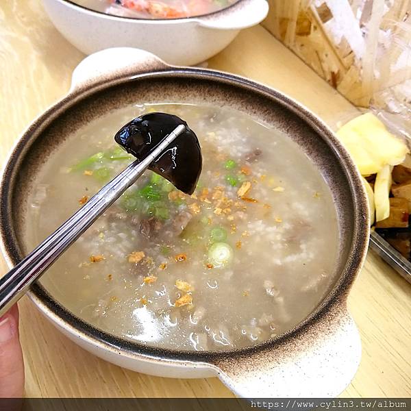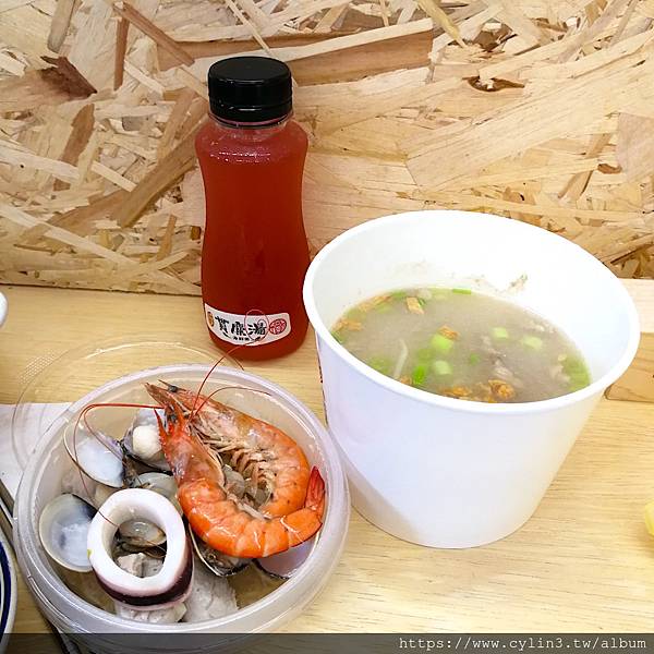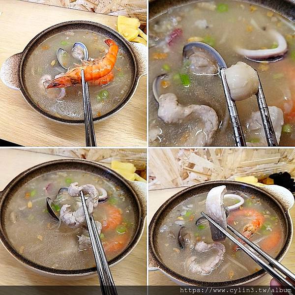 這碗「粥澎湃」,內容有:蛤蜊、白蝦、鮮魷、干貝、魚肚條、筍絲、香菇、肉絲,是店內招牌餐點,無論是新鮮的大隻鮮蝦、充滿台南風情的虱目魚肚條或是夾到小干貝的驚喜,每一口都讓人感受到濃濃的大海精華,整碗湯頭海味濃郁,鮮甜味美,讓我離去時忍不住再外帶一碗,打算帶回家給老媽嚐嚐。
