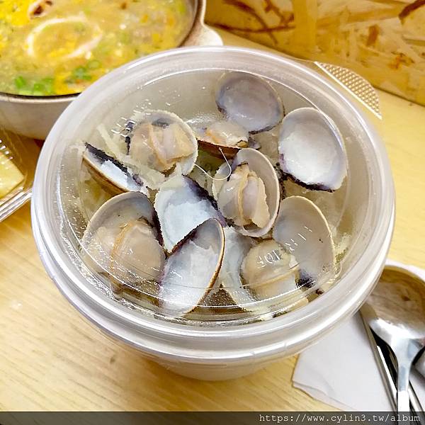 「老莫貫糜湯」目前也有與外送平台ubereats合作,不過外送餐點與店內餐點有些不同,大家可以滑滑手機看看詳細菜單,順便看看您是否是他們外送服務範圍喔~這日剛好遇到外送客人點這道料理,就拜託老闆讓我拍拍照,簡單介紹給大家,這碗蛤蜊是優選來自台南七股在地養殖的,一碗內約有六顆飽滿多汁的蛤蜊。