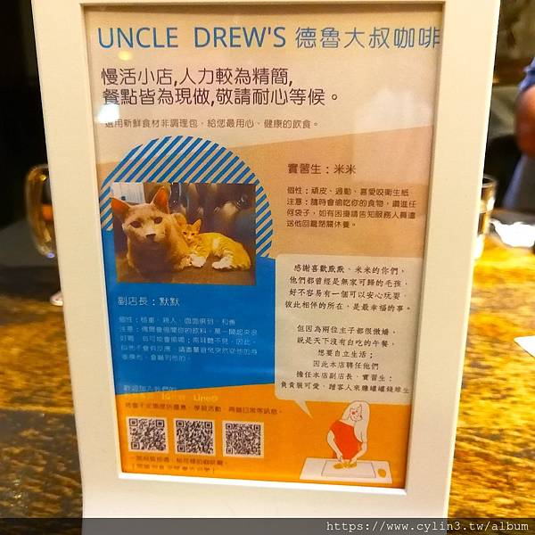 「德魯大叔咖啡館」是家寵物友善的咖啡店,店內也有養小貓咪,因此提醒大家推開門時要注意,不要讓小貓咪溜出來喔~