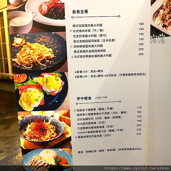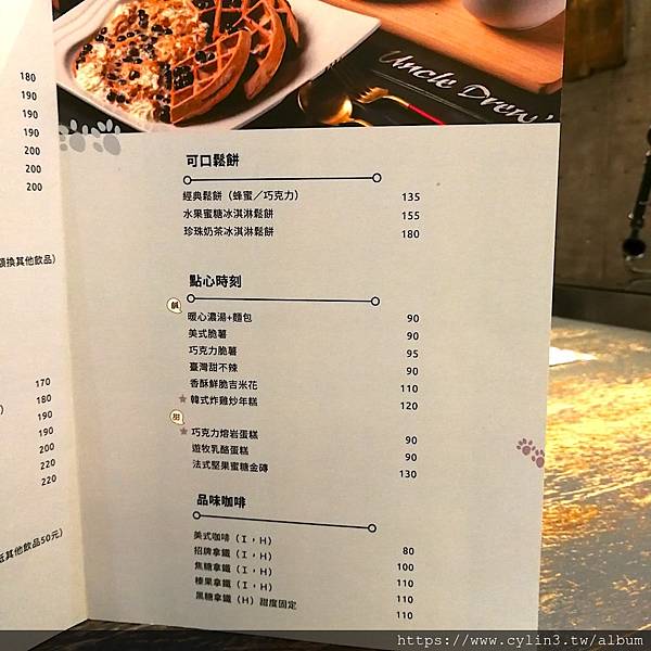 介紹完店內環境,來介紹餐點喔~首先看看「德魯大叔咖啡館」菜單,「德魯大叔咖啡館」的餐點有:義大利麵、丼飯、燉飯、早午輕食、可口鬆餅、點心時刻,另外飲料有:咖啡、茶、氣泡飲、養生醋飲,價位約NT$100~200左右,免服務費,低消NT$100,以高雄市文化中心鄰近餐廳而言,滿划算的。
