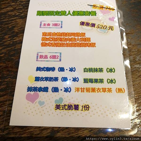 胖胖顰是在2020年歲末聖誕節期間來訪,這日來,店家另外還有期間限定雙人優惠套餐的菜單供參考,覺得CP值很高,不過優惠套餐只到2020年12月31日止,不知道目前「德魯大叔咖啡館」有無推出新優惠?大家若來訪可以主動問問店家喔~