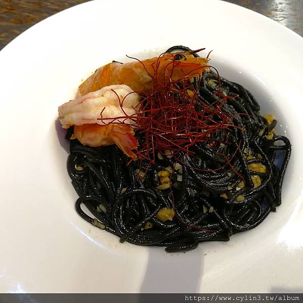 黑嚕嚕的「蒜味鮮蝦墨魚義大利麵」也是店內人氣商品,店家表示說微辣,不知道是不是指上頭切絲的辣椒絲可能有些微辣?!但我們覺得吃不太出來說^^這道餐點因為有蒜香,香氣更濃郁,鮮蝦有兩隻,一隻店家已經幫你剝殼了,另一隻因為擺盤希望漂亮的關係蝦子呈現比較完整,但別擔心,店家已經貼心的把蝦殼稍微劃開,你可以輕易剝殼的;這道料理很得小清的青睞。