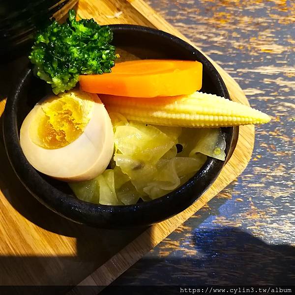 小小的配菜碗內,有半顆金黃的蛋,還有水煮蔬菜,另外還有百香果醬醃漬的白蘿蔔,其中老弟說百香果醬醃漬的白蘿蔔,味道酸甜酸甜,果香撲鼻,清爽開胃又解膩,他很喜歡。