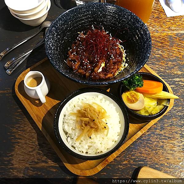 這是老弟點的「日式燒肉丼飯」,也是菜單上有標示星星的餐點,這道餐點因為還有多樣配菜,所以等候時間比較久一些,但端上桌時讓我們眼睛一亮,感覺很豐富!