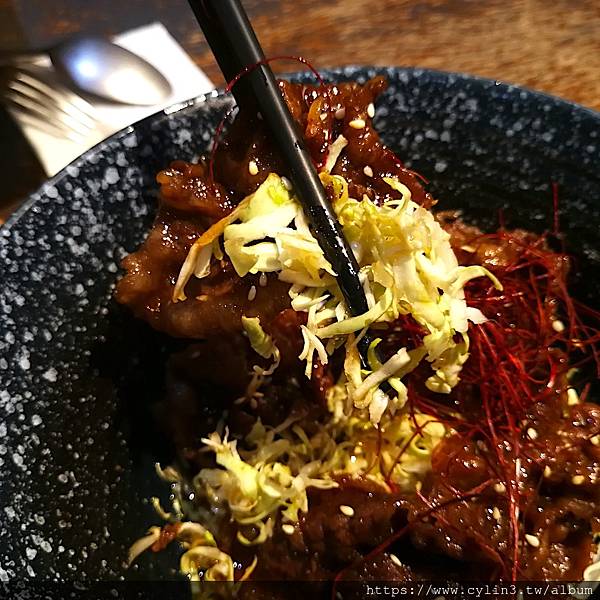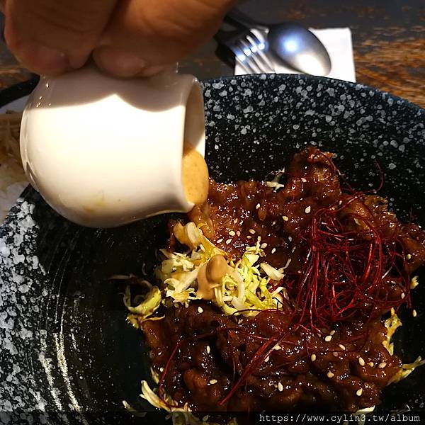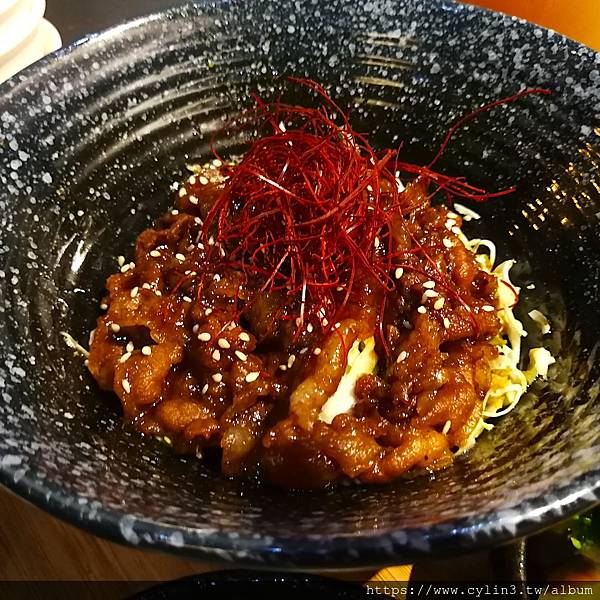 燒肉部分,特製醬汁醃漬過的牛肉片煎的好入味,味道雖然比較重鹹,但燒肉下方撲了滿滿的高麗菜絲,剛好均衡味道,店家還提供了胡麻醬,你可以淋在高麗菜絲上,讓整體味道又多了一份香甜感,味道呈現更多層次,老弟吃得很滿足。